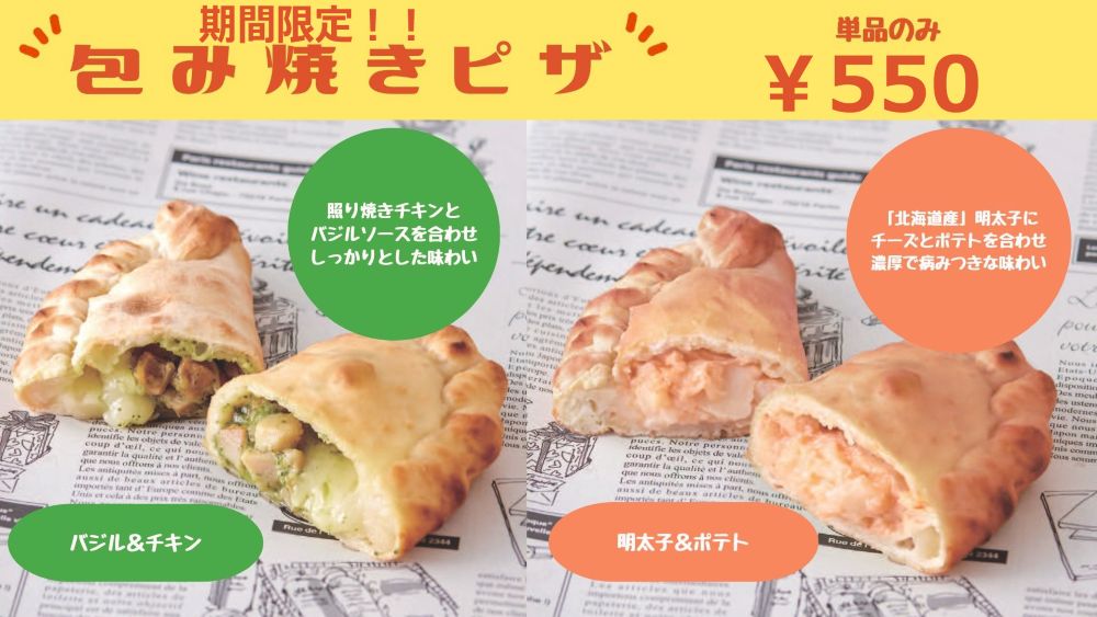 この冬、期間限定で『包み焼きピザ』が新登場!!『バジル&チキン』と『明太子&ポテト』の2種類からお選びいただけます!