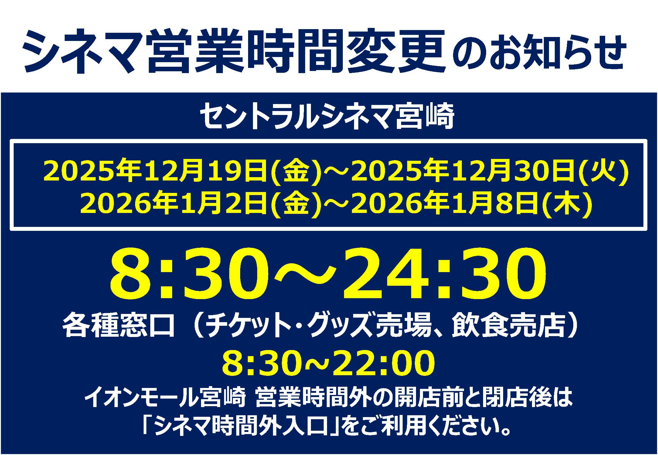 ・12/19(金)~12/30(火) 8:30~24:30 売店は22:00閉店