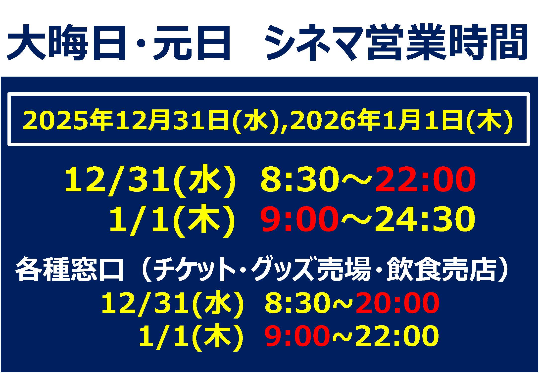 ・1/1(木) 9:00~24:30 売店は22:00閉店