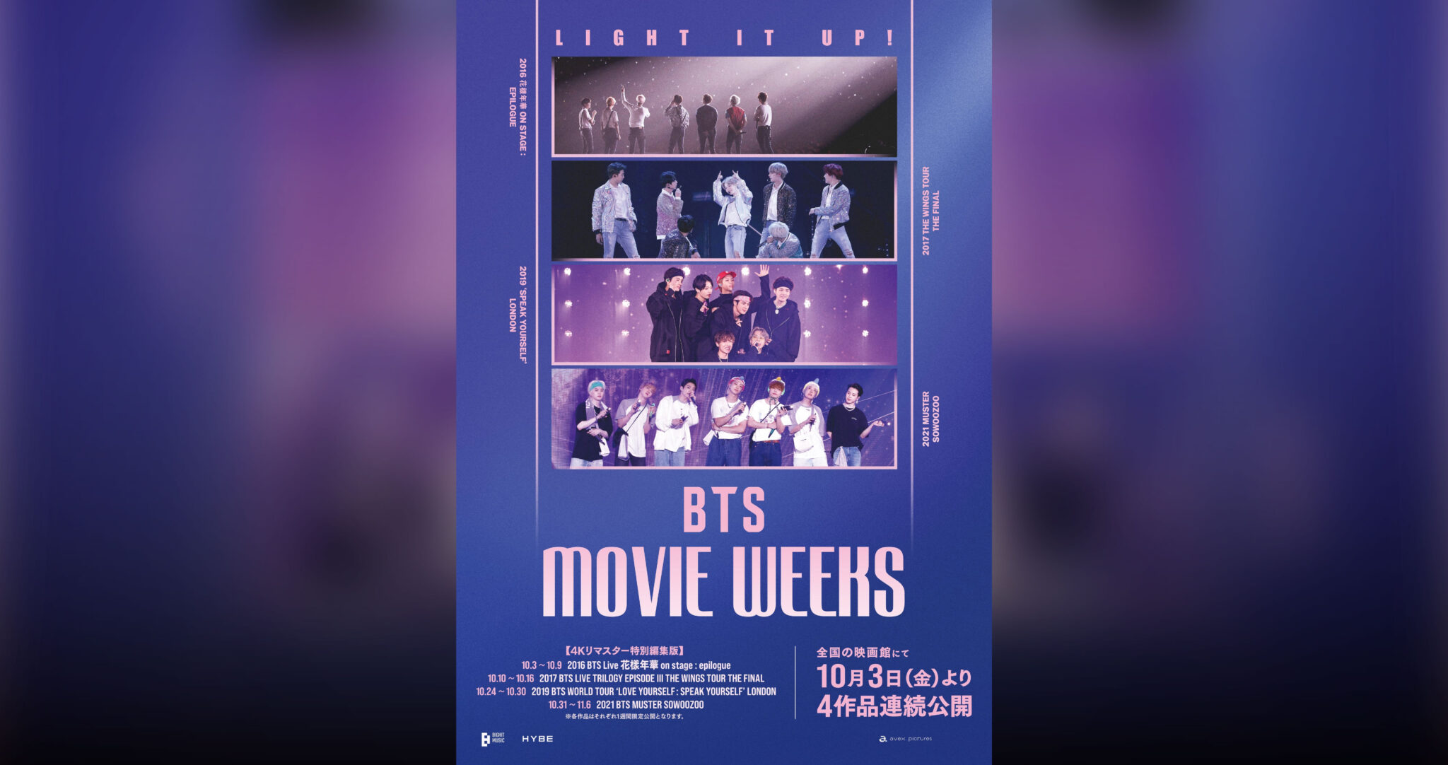BTS(防弾少年団)のこれまでの軌跡を辿るライブ映像を4作品連続で劇場公開する「BTS MOVIE WEEKS」の上映が決定!2016年に開催された「2016 BTS Live 花樣年華 on stage : epilogue」に始まり、2017年の「2017 BTS LIVE TRILOGY EPISODE III THE WINGS TOUR THE FINAL」、2019年の「2019 BTS WORLD TOUR ‘LOVE YOURSELF: SPEAK YOURSELF’ LONDON」、そして2021年の「2021 BTS MUSTER SOWOOZOO」の全4作品を今回の企画のために特別に4Kリマスター版へと再編集。