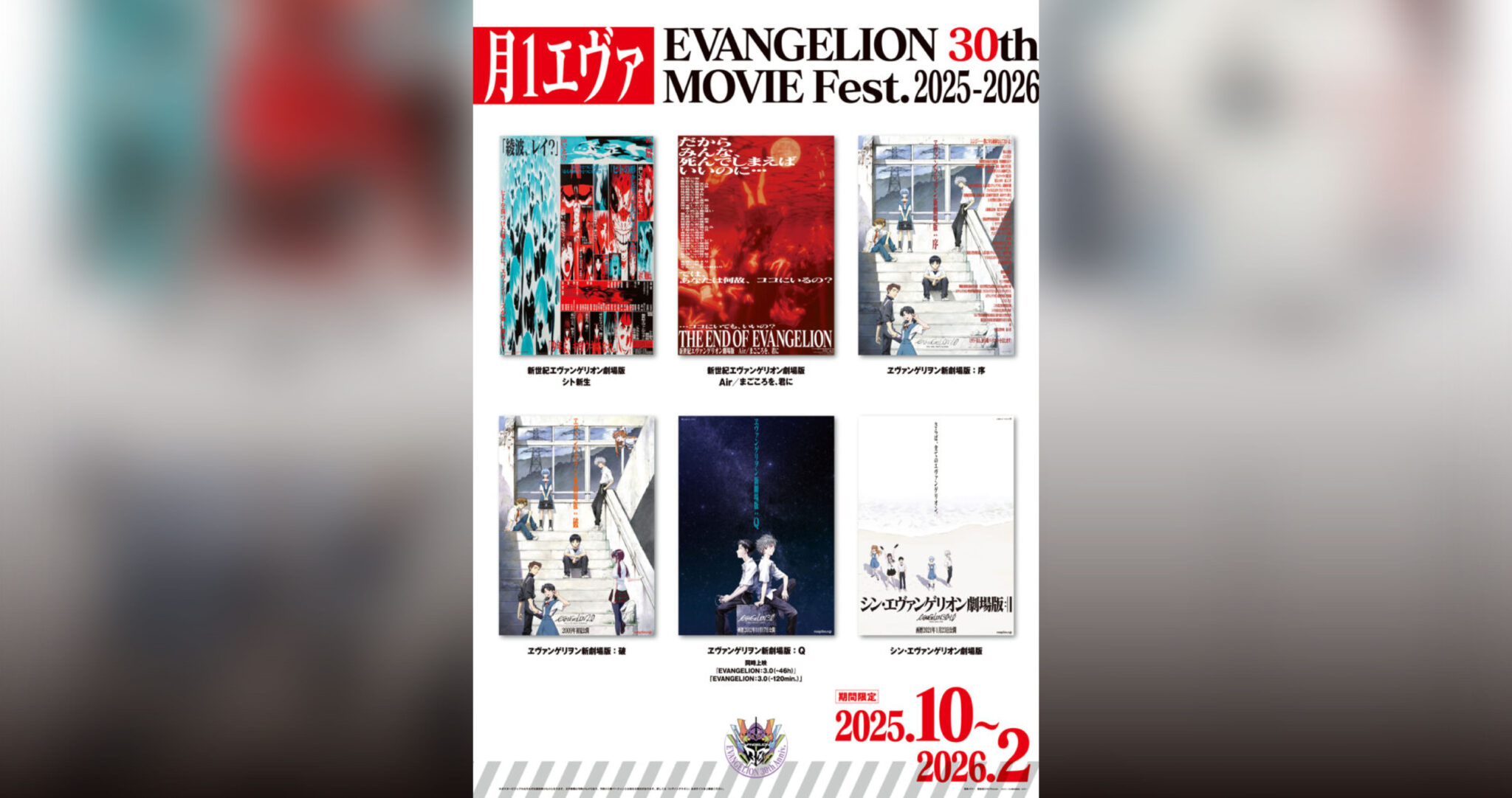 『月1エヴァ EVANGELION 30th MOVIE Fest.2025-2026』(略称:月1エヴァ/読み:ツキイチエヴァ)と題し、2025年10月から2026年2月までの間、各月に1作品(10月は2作品)、それぞれ1週間ずつの期間限定で、10月『新世紀エヴァンゲリオン劇場版 シト新生』、『新世紀エヴァンゲリオン劇場版 Air/まごころを、君に』、11月『ヱヴァンゲリヲン新劇場版:序』、12月『ヱヴァンゲリヲン新劇場版:破』、1月『ヱヴァンゲリヲン新劇場版:Q』、2月『シン・エヴァンゲリオン劇場版』の6作品が全国の劇場にて上映されます。